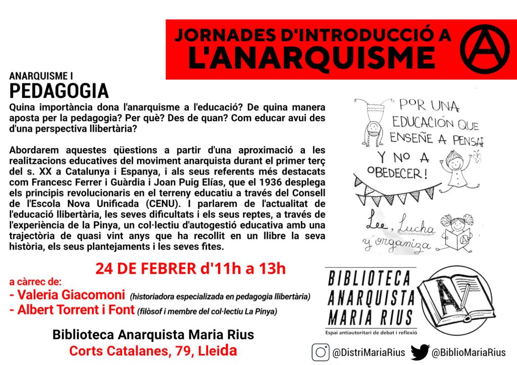 La Biblioteca Anarquista Maria Rius nació en 2017 para dotar a la ciudad de Lleida y sus alrededores de un espacio político donde difundir el pensamiento y las prácticas libertarias y potenciar el conocimiento, la reflexión y el debate.