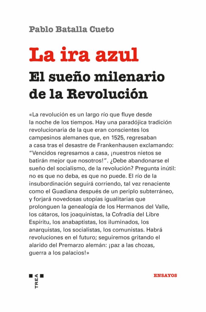 «Y en la revolución pensábamos: un mar cuya ira azul tragase tanta fría miseria». Los versos de Luis Cernuda de Lamento y Esperanza sirven a Pablo Batalla para dar título a su última obra, La ira azul. El sueño milenario de la Revolución.