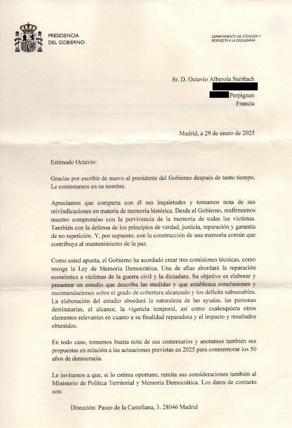 En respuesta a mi última carta al Presidente del Gobierno, Pedro Sánchez, en la que le recordaba la infame discriminación de que son objeto las víctimas de la represión franquista ejecutadas antes de 1968. los responsables del Departamento de atención y respuesta a la ciudadanía, contestándome en su nombre, me informan que el Gobierno ha acordado crear tres comisiones técnicas en cumplimiento de la Ley de Memoria Democrática y que «una de ellas abordará la reparación económica a víctimas de la guerra civil y la dictadura», con el objetivo de «elaborar y presentar un estudio que describa las medidas y que establezca conclusiones y recomendaciones sobre el grado de cobertura alcanzado y los déficits subsanables».
