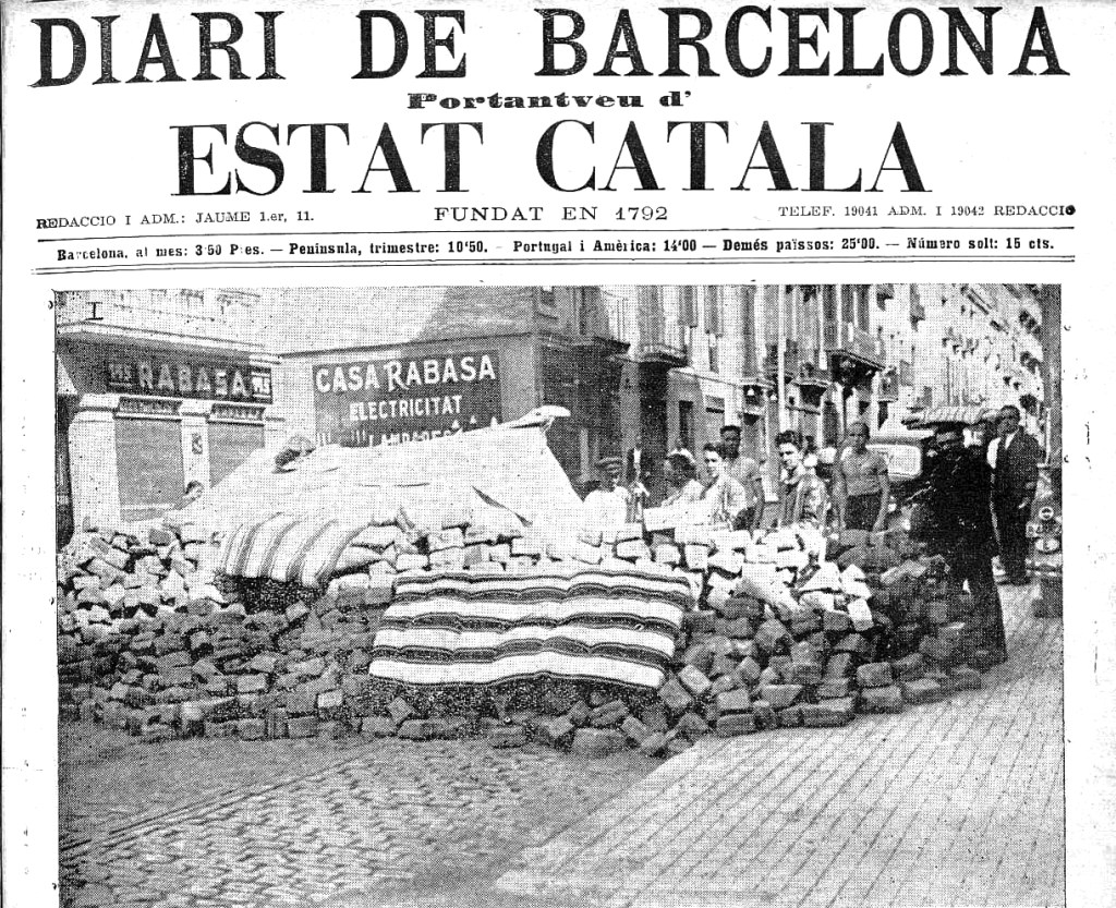 Y ahí, en esas primeras horas de la madrugada del 19, se erige “nuestra barricada”, la que aparece en las fotos, barrando el paso de la calle Salmerón (la actual Gran de Gràcia) y controlando la calle de las Carolinas y de Santa Águeda. Su ubicación respondía al hecho de que a poco más de veinte metros estaba situado el local del sindicato de barrio de la CNT, en el número 211 de la misma calle. Así pues, la autoría queda clara, por más de que poco después, ya derrotado el golpe en la ciudad, fueran a hacerse fotos la gente de Estat Català y que apareciese en la portada del Diari de Barcelona del día 25 de julio, recién incautado por esos nacionalistas, que desde la “Conselleria de Governació” se habían ensañado con los anarquistas, pocos años atrás.