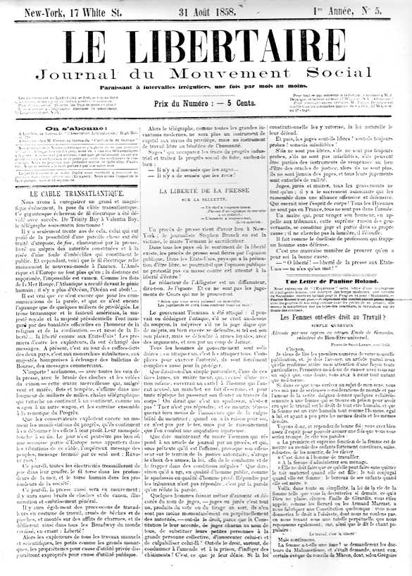 A partir del año siguiente, ya desde Nueva York, publicó un periódico dirigido a la comunidad francófona, Le Libertaire, del que aparecieron veintisiete números a lo largo de poco más de dos años y medio, entre el 9 de junio de 1858 y el 4 de febrero de 1861. En Francia, el término fue difundiéndose a partir de la década de 1880. En los primeros años de la década de 1890, cobraron fuerza entre algunos sectores radicalizados del movimiento anarquista las tácticas de la propaganda por el hecho, unas prácticas «aceleracionistas» (censuradas por muchos; entre ellos, Kropotkin) que primaban los atentados por encima de la acción colectiva en favor del hermoso ideal de una sociedad utópica. La draconiana represión gubernamental y el deseo de eludir la prohibición de las publicaciones anarquistas llevaron al auge de la palabra libertaire, que también arraigó en esa última década del siglo al otro lado de los Pirineos.