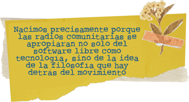 Santiago: Toda digamos, Radios Libres surge un poco precisamente por el software libre, nos ha tocado masticar mucho todo lo tecnológico porque no lo conocíamos, hemos intentado precisamente el traducir todo lo del software libre para que la radio pudiera acercarse sin ese temor, desmitificando también todo lo que existe alrededor del software libre, todas las mentiras, de qué nos sirve, entonces la relación está en la génesis, en el ADN, porque nacimos precisamente por difundir y que las radios comunitarias se apropiaran no solo del software libre como tecnología, sino de la idea de la filosofía que hay detrás del movimiento del software y la cultura libre.