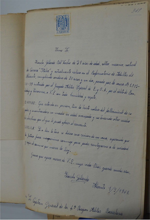 Cuando estaba en la cárcel de Alicante recibe la triste noticia desde Italia de la muerte de su padre y él con una carta manuscrita pide que lo pongan en libertad para poder socorrer económicamente a su madre de avanzada edad.