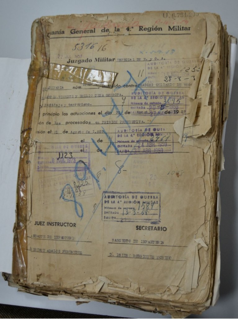 12 de agosto de 1958 se inicia el proceso en el Juzgado Militar ordinaria número 1013-IV-57 contra Fiaschi Goliardo de Vecchia, Luis Agustín Vicente y Emilio Tena Gorrita. Bandidaje y terrorismo prisión preventiva desde el 31 de agosto de 1957.