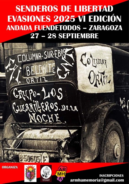 La marcha arranca el sábado 27 en Fuendetodos y culmina el domingo en Zaragoza, en el Torrerico Libertario, tras 41 kilómetros de recorrido nocturno, evocando los pasos de las expediciones que, durante la Guerra de 1936, arriesgaron sus vidas para sacar de la capital aragonesa personas amenazadas por la represión franquista. Una gesta de solidaridad en tiempos de terror.