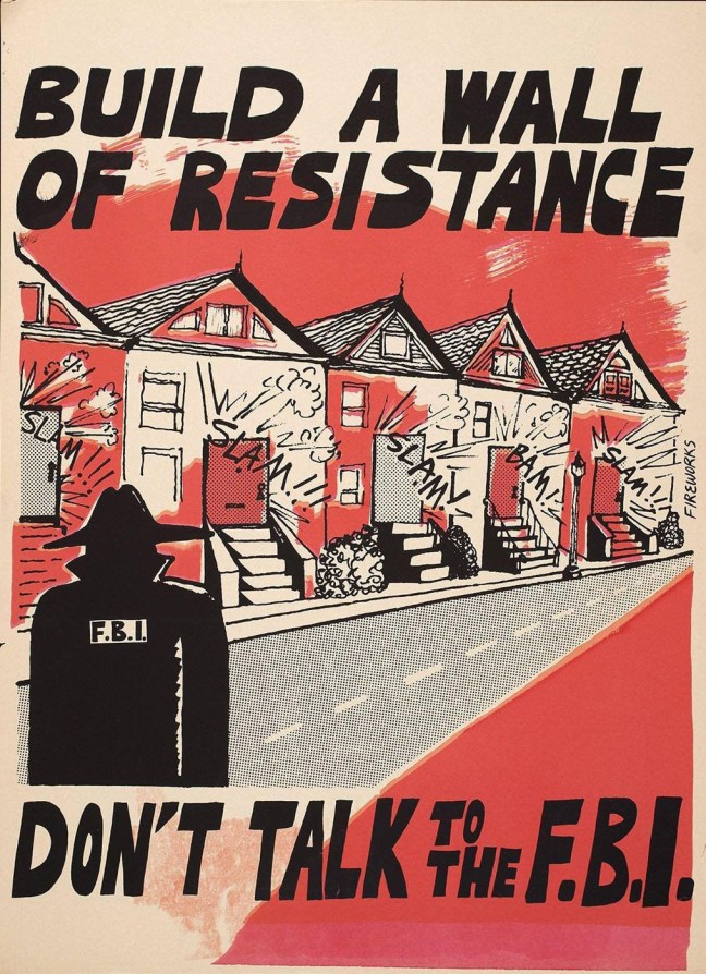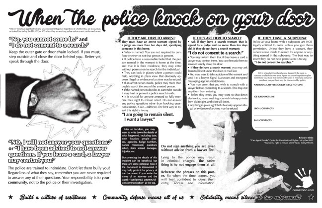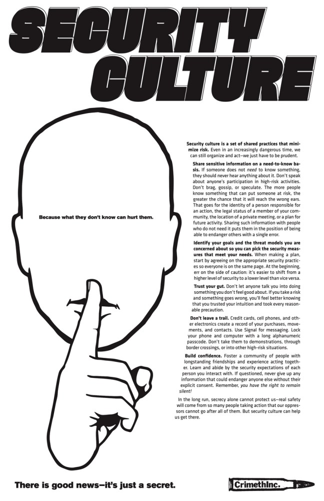 Del mismo modo, difunde lo más ampliamente posible la información sobre cómo contrarrestar la represión. Organiza eventos educativos periódicos en tu comunidad sobre cultura de la seguridad y distribuye materiales al respecto. Educa a las personas sobre cómo responder si los agentes las presionan para que se conviertan en informantes o las citen ante un gran jurado. Cuanta más gente conozca estas cosas, mejor, ya que los agentes federales a veces comienzan ejerciendo presión sobre aquellas personas que perciben como periféricas de los movimientos sociales.