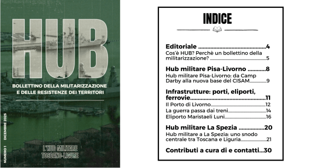 HUB es un boletín informativo para la información, la investigación, el análisis y el intercambio sobre la militarización de los territorios. Surgió en el campamento Base No los días 5, 6 y 7 de septiembre de 2025, durante la asamblea dedicada a construir alianzas entre los territorios afectados por la transformación en centros estratégicos de guerra. A través de debates entre trabajadores, movimientos y residentes de Livorno, Pisa, Florencia, Carrara y La Spezia, incluyendo a quienes luchan contra las bases militares y a quienes trabajan y luchan en los ferrocarriles y puertos, nació la intención de emprender un camino común. El boletín HUB representa la propuesta en torno a la cual queremos compartir este viaje: una revista digital y en papel no periódica que ofrece perspectivas y contribuciones sobre el funcionamiento del centro militar en el que estamos inmersos, para comprender el sistema de guerra que permea estos territorios y para desarrollar la cooperación y el intercambio necesarios para organizarnos cada vez más eficazmente, y así bloquear e imaginar las alternativas dignas que la sociedad necesita.