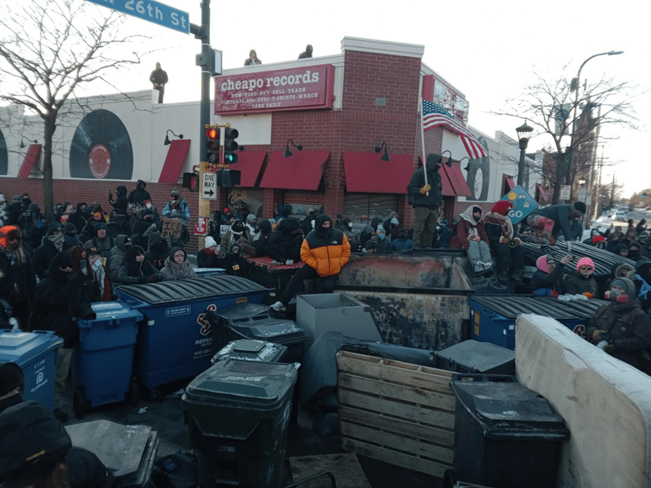 Parecía que todas las pequeñas barricadas que la gente de Whittier había erigido habían sido reubicadas aquí, bloqueando Nicollet por ambos extremos. La gente se sentaba encima de los contenedores de basura, tamborileando sobre las tapas. La multitud parecía más diversa racialmente de lo que jamás había visto en ese barrio. Una bandera mexicana ondeaba cerca del centro de la multitud.