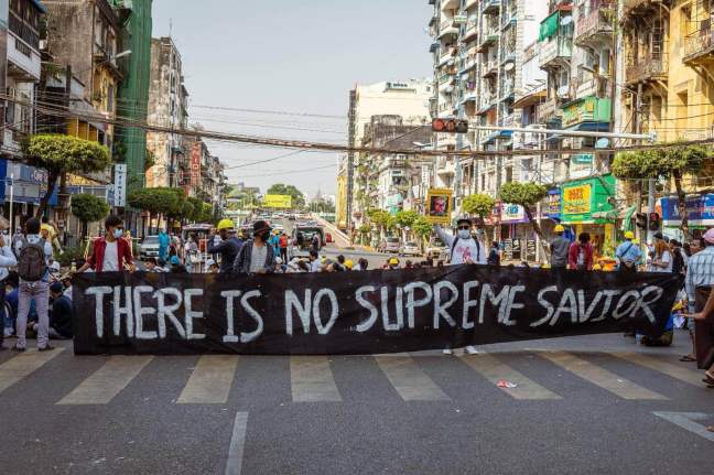 La mañana del golpe, conversé con compañeros que trabajaban en la Federación Panbirmana de Sindicatos Estudiantiles (ABFSU), una de las principales organizaciones estudiantiles de izquierda del país, y con miembros de nuestro grupo anarquista antifa sobre cómo movilizar a la gente para que saliera a las calles. Sin embargo, figuras importantes de la Liga Nacional para la Democracia (LND) que aún no habían sido arrestadas, junto con partidarios de [la política birmana] Aung San Suu Kyi, instaron a la población a no actuar de inmediato y a esperar setenta y dos horas. Difundían la creencia de que la ayuda internacional, e incluso una intervención basada en la Responsabilidad de Proteger (R2P)4 pronto llegaría, animando a la gente a quedarse en casa en lugar de salir a las calles a protestar.