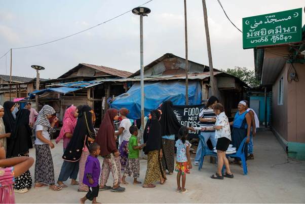 Fue también durante este periodo en Yangón que empezamos a colaborar con Food Not Bombs Burma. Kyaw Kyaw, vocalista de la banda punk Rebel Riot, había empezado a organizar actividades de Food Not Bombs en Yangón a principios de la década de 2010, y muchas de sus canciones políticas nos influyeron profundamente. A partir de entonces, Food Not Bombs, Anonymous Burma y ABFSU colaboraron a menudo en protestas y en la organización política y social.