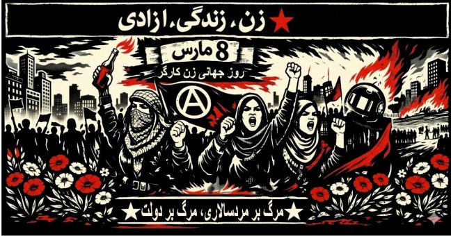Nota de la redacción: El texto de la imagen principal pone: «Mujer, Vida, Libertad» (Zan, Zendegi, Azadi) / «8 de marzo» / «Día Internacional de la Mujer Trabajadora» / «¡Muerte al patriarcado, muerte al Estado!»