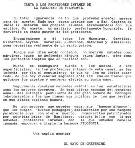 Para más, luego salió una Carta al autor de la carta a los profesores infames, salida, a todas luces, de la mano de un profesor, lo cual fue rizar el rizo y dio lugar a nuevas interpretaciones y especulaciones.