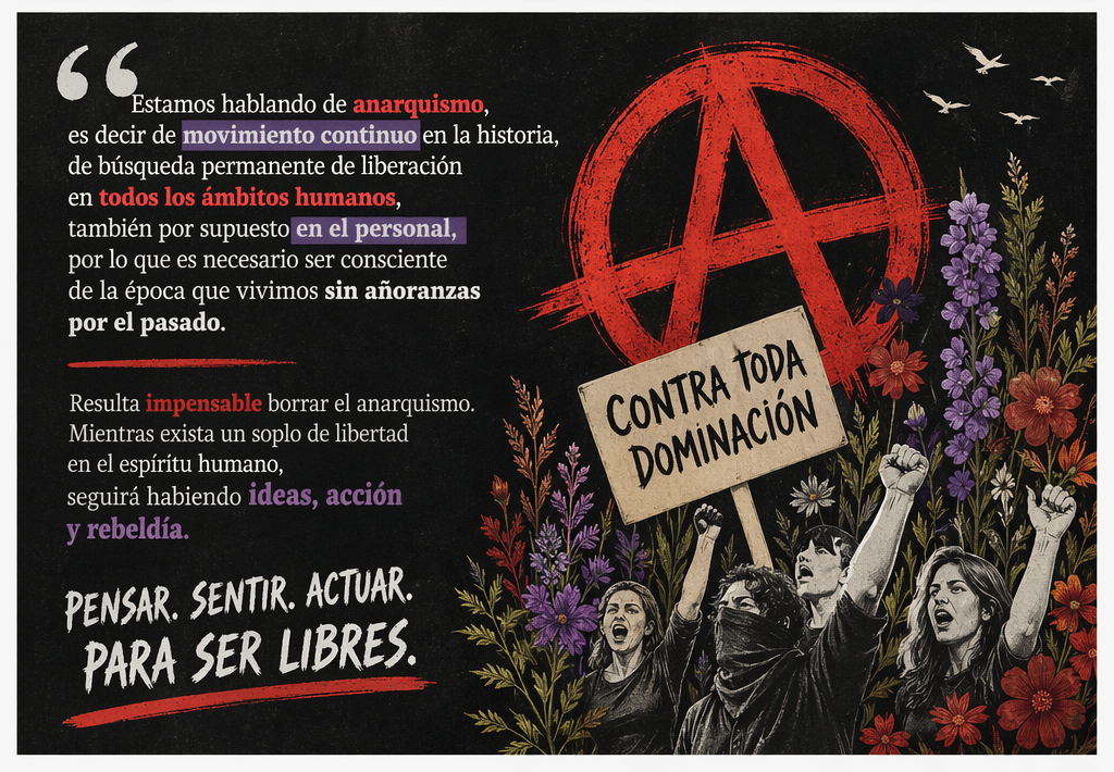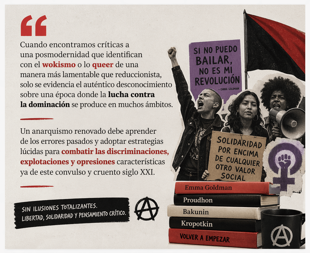 Uno lee, y relee, con sumo gusto a grandes pensadores como Proudhon, Bakunin o Kropotkin, entre muchos otros, pero siempre con una mirada crítica hacia todo lo que podía unirles a la época que vivieron. No es cuestión de, simplemente, ponerles la etiqueta de homófobos, o incluso de machistas en algunos aspectos, es tan sencillo como comprender que pudieron estar adelantados en su pensamiento y acción en muchos aspectos, pero de forma obvia no en todos. Si alguien afirma, sin ningún asomo de vergüenza, que le gusto prácticamente todo lo que intelectual y moralmente legó tal o cual autor, lo siento, pero me parece un dogmático como la copa de un pino. No es casualidad que podamos encontrar a veces rasgos emancipadores más interesantes en autoras ácratas y solo podemos recordar aquella frase atribuida a Emma Goldman (aunque, al parecer, nunca la dijera exactamente así): «Si no puedo bailar, no es mi revolución». Cuando encontramos estas críticas a una posmodernidad, que identifican con el wokismo o lo queer de una manera más lamentable que reduccionista solo se evidencia el auténtico desconocimiento sobre una época donde la lucha contra la dominación se produce en muchos ámbitos, donde un anarquismo renovado (o como lo queramos llamar en sus múltiples formas antiautoritarias) debe aprender de los errores pasados y adoptar estrategias lúcidas para combatir las discriminaciones, explotaciones y opresiones características ya de este convulso y cruento siglo XXI. Nadie esta renunciando a la razón, al pensamiento crítico, ni el conocimiento en todos los campos, armas irrenunciables en todo proyecto libertario emancipador, simplemente tratamos de ampliar el horizonte de todo ello sin ilusiones totalizantes propias del pasado. En respuesta a uno de los textos que han dado origen a esto que estoy escribiendo, perded cuidado, nadie está tratando de borrar el anarquismo. Resulta impensable mientras exista un soplo de libertad en el espíritu humano. Hoy, nos hemos puesto profundos y algo líricos.