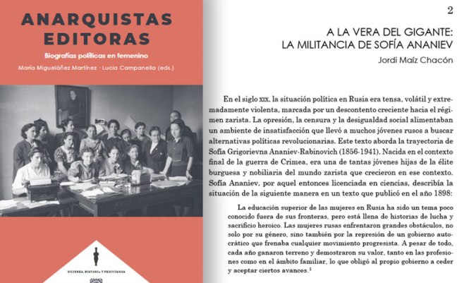 Jordi Maíz Chacón El libro, Anarquistas editoras. Biografías políticas en femenino, coordinado por María Migueláñez Martínez y Lucía Campanella, está publicado por la editorial Comares (2025). El contenido del libro está dividido en dos partes: la primera, titulada "Mujeres en el circuito editorial anarquista" y la segunda parte, "Redes editoriales en femenino". En total hay … Continúa leyendo Anarquistas Editoras: A la vera del gigante: la militancia de Sofía Ananiev