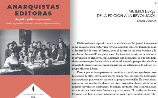 Laura Vicente El libro, Anarquistas editoras. Biografías políticas en femenino, coordinado por María Migueláñez Martínez y Lucía Campanella, está publicado por la editorial Comares (2025). El contenido del libro está dividido en dos partes: la primera, titulada "Mujeres en el circuito editorial anarquista" y la segunda parte, "Redes editoriales en femenino". En total hay once contribuciones de … Continúa leyendo Anarquistas Editoras — Mujeres Libres: de la edición a la revolución
