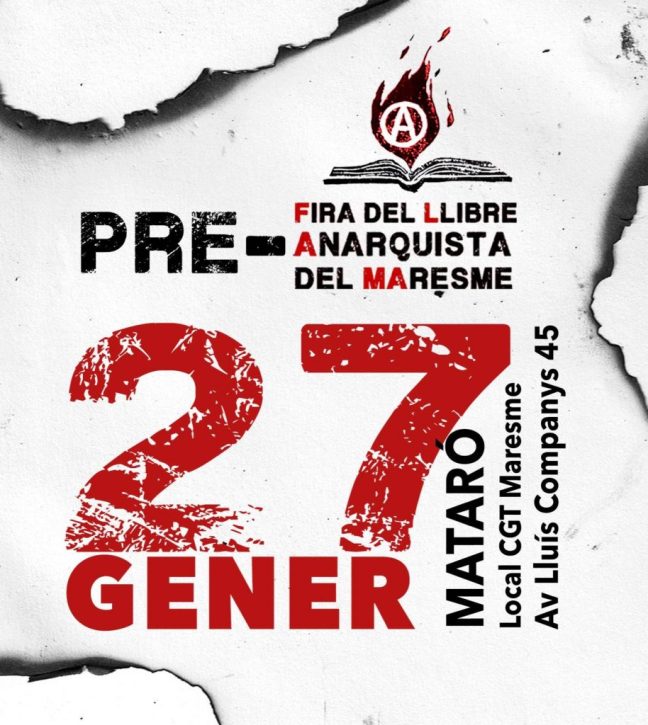 Este 2024 podremos disfrutar de la Feria del Libro Anarquista del Maresme en su quinta edición, y para ir calentando, el 27 de enero, celebraremos la Pre-Feria en los locales de la CGT Maresme, Avenida Lluís Companys 56, Mataró. Queremos remarcar que la Feria es un espacio transfeminista, apostamos por un espacio donde todas las … Continúa leyendo Vuelve la Feria del Libro Anarquista del Maresme